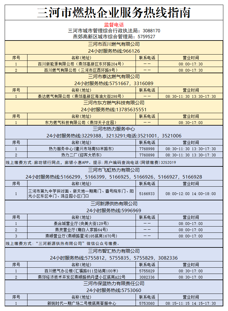 三河、燕郊供暖及燃气企业监督电话和服务热线公布!